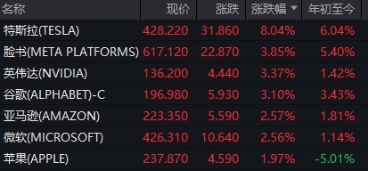 大型科技股全线上涨,其中特斯拉暴涨8.04%,脸书、英伟达、谷歌涨超3%。热门中概股同样表现不俗,纳斯达克中国金龙指数上涨0.97%,斗鱼、网易等个股涨幅较大。值得一提的是,从事模块化建筑等业务的SAFE&GREEN公司股价暴涨74.98%,盘中一度涨逾220%,并出现两次熔断,成为市场的焦点之一。