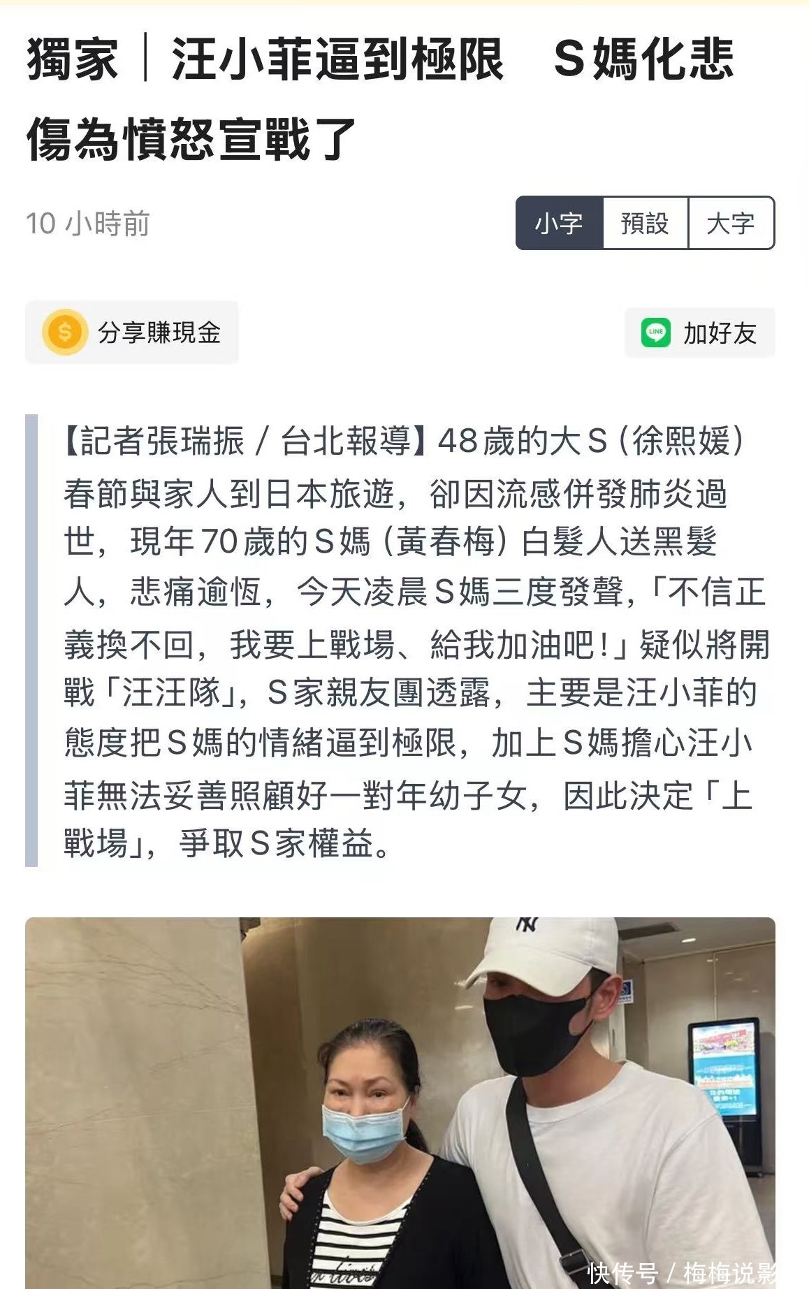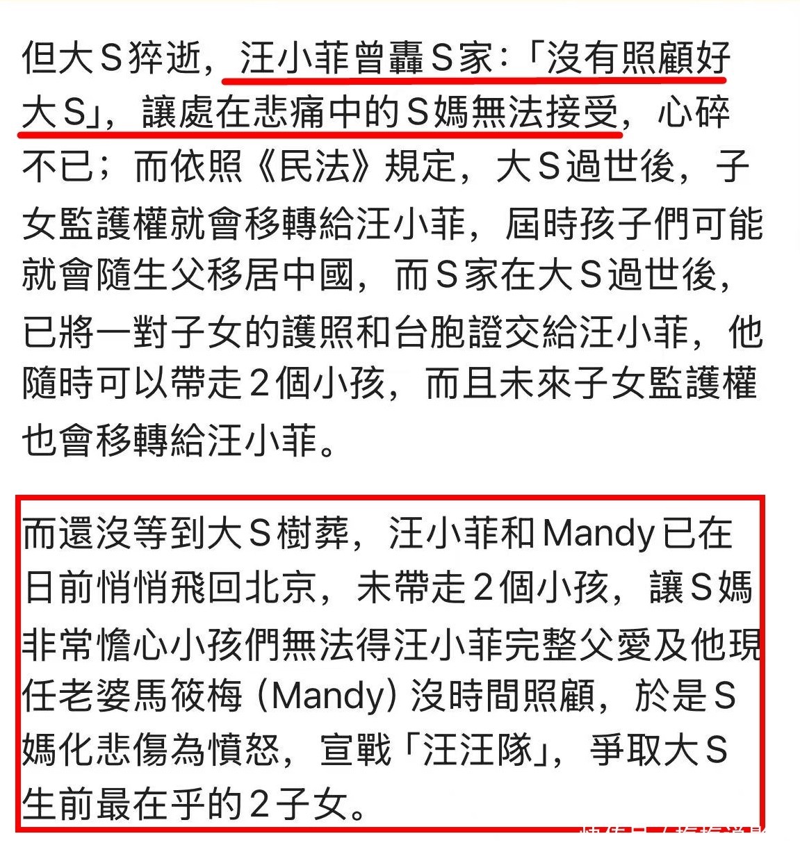 其实,徐妈妈宣战后,网友猜测跟大S的遗产有关,因为两个孩子的监护人已成定局,剩下的就只有遗产争夺战了。